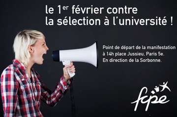 La FCPE, pleinement mobilisée sur l'enjeu majeur de la période que constitue la question de l'accès des bacheliers aux études supérieures, appelle à soutenir la mobilisation du 1er février et invite tous ses adhérents et l'ensemble des parents d'élèves parisiens à se retrouver à 14h place Jussieu, Paris 5e.