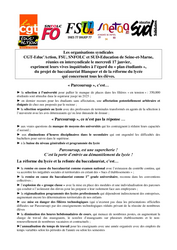 Les organisations syndicales CGT-Educ'Action, FSU, SNFOLC et SUD-Education de Seine-et-Marne, réunies en intersyndicale le mercredi 17 janvier, expriment leurs vives inquiétudes à l'égard du « plan étudiants », du projet de baccalauréat Blanquer et de la réforme du lycée qui concernent tous les élèves.