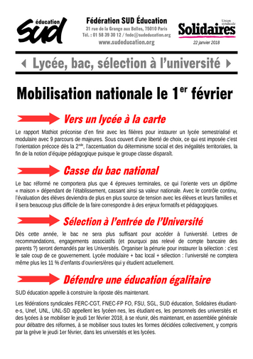 Les fédérations syndicales FERC-CGT, FNEC-FP FO, FSU, SGL, SUD éducation, Solidaires étudiant-e-s, Unef, UNL, UNL-SD appellent les lycéen·nes, les étudiant·es, les personnels des universités et des lycées à se mobiliser le jeudi 1er février 2018, à se réunir, dès maintenant, en assemblée générale pour débattre des réformes, à se mobiliser sous toutes les formes décidées collectivement, y compris par la grève le jeudi 1er février, dans les universités et les lycées.