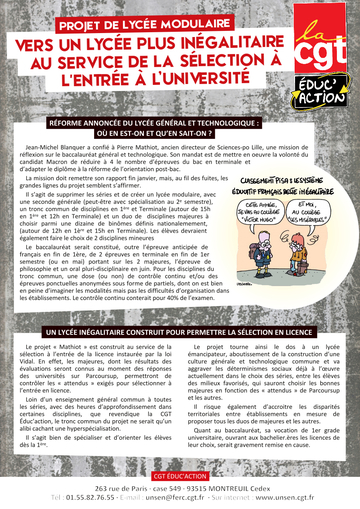 A la CGT, au contraire, nous militons pour un lycée unique et polytechnique ayant un large tronc commun et quelques éléments d'approfondissements pour permettre aux élèves de plus pratiquer ce qu'ils préfèrent sans pour autant abandonner les autres disciplines. Cela évite les orientations précoces, permet la construction d'une culture commune de haut niveau pour tou.tes les élèves et évite la hiérarchisation des filières. Cela passe bien entendu par la réduction des effectifs à 24 élèves par classe, du travail en petits groupes, et bien d'autres évolutions.