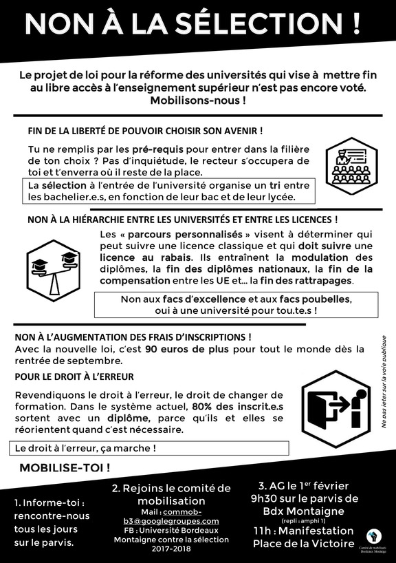 - à participer au meeting national « La sélection n'est pas la solution » le samedi 20 janvier à 14h, à la bourse du travail à Paris (métro République) ;