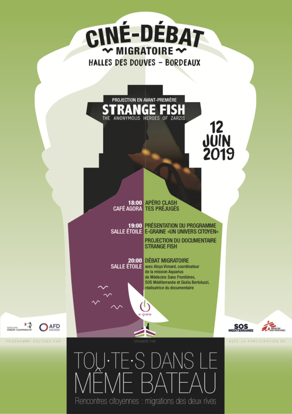 Au programme : un apéro pour clasher vos préjugés suivi d'un ciné-débat après la projection de "Strange Fish" - film documentaire sur la mobilisation des pêcheurs de Zarzis (Tunisie) dans les sauvetages en mer - en présence de sa réalisatrice et de Aloys Vimard, coordinateur de la mission Aquarius de Médecins Sans Frontières.